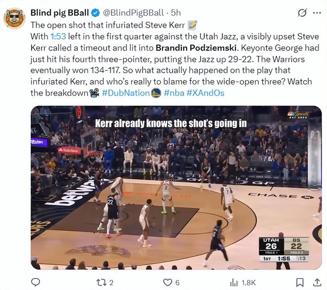 勇士VS爵士比赛的第一节还剩1分54秒,波杰姆斯基目送乔治大空位三分命中,科尔暴怒暂停冲入场内朝着波杰姆斯基一顿狂喷,科尔大骂波杰姆斯基态度散漫。